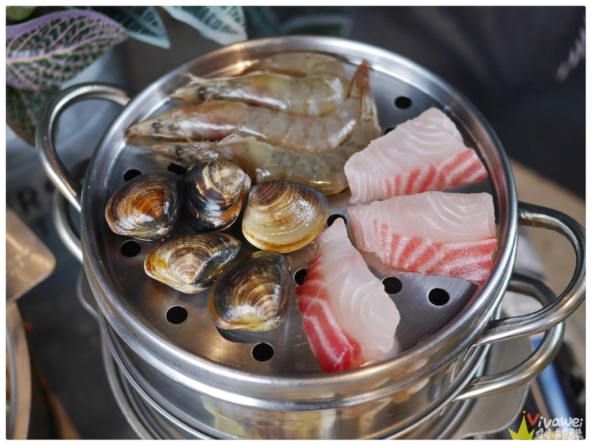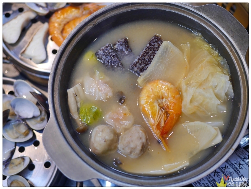 ▲蒸煮鍋附有香濃雞湯鍋、菜盤、鮮蛤蜊、白飯、和飲料!還可以選擇一款肉品!我們的肉品是選鯛魚片、A區選的是大草蝦、B區選了綜合拼盤!還額外+158元加點了牛奶貝!