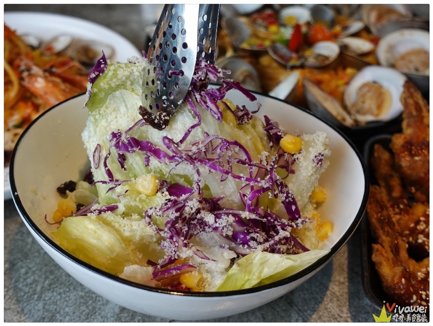▲這是套餐附贈的沙拉,店家直接幫我們做成兩人份!裡面有生菜、葡萄乾、玉米粒、起司粉~