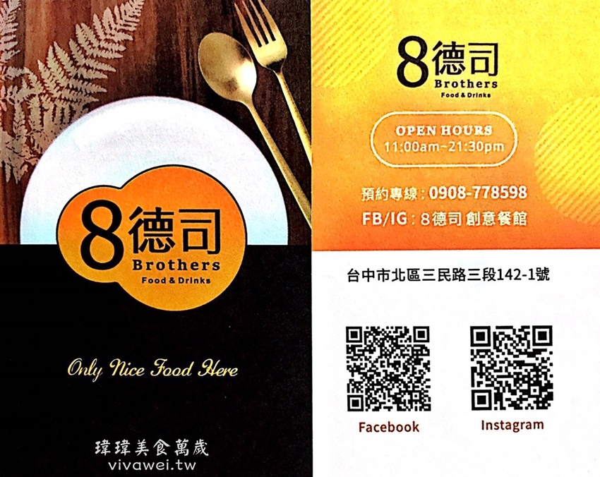 ▲整體來說,這間「8德司Brothers」的餐點選擇多元,而且就在一中街旁邊,交通十分便利,很適合情侶約會或是三五好友來聚餐!無論想吃好吃的義大利麵、燉飯、炸物、披薩、海盜船火鍋、蒸煮鍋這裡都能一次滿足你!個人私心推薦冠軍蛤蜊辣醬Q麵&炸雞們&搭上蒜香凱薩醬的招牌脆薯!絕對是一間還會想要再訪的餐廳😋