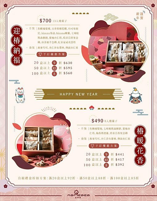2021新春限定燒菓子禮盒,共分兩款”迎椿納福“13入燒菓子,”椿暖花香“8入燒菓子,今年多了三款新品,傳說杏仁果、杏仁莎布蕾棒以及焙茶百香果金磚放入精選兩款禮盒內,亦可依照個人預算搭配放入客製化禮盒中唷!! 餅乾常溫15天/蛋糕冷藏15天,常溫10天
