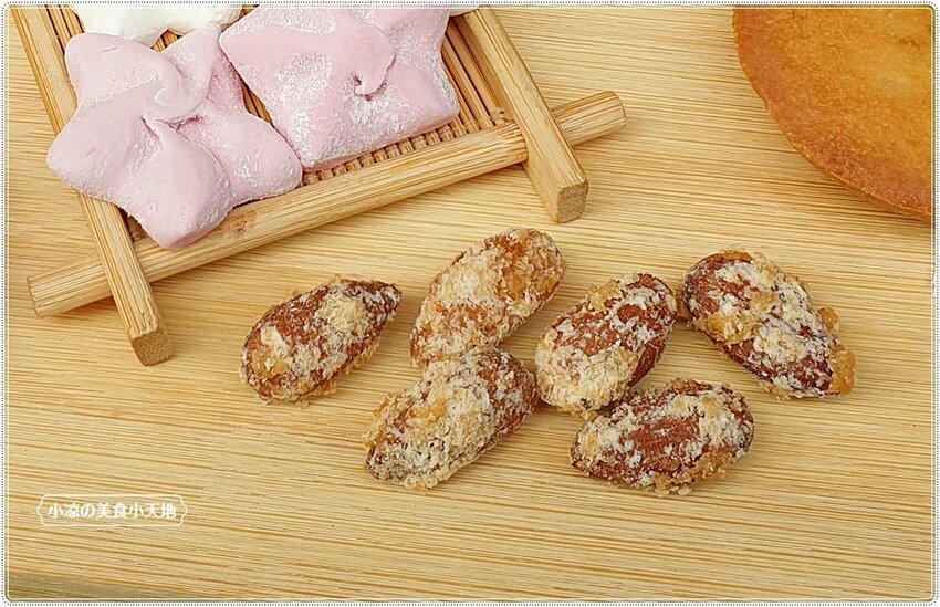 杏仁莎布蕾棒,表層有著薄薄焦糖、杏仁片以及蔓越莓果乾,吃起來不單涮嘴,又酥脆不黏牙,這可是追劇必備零嘴