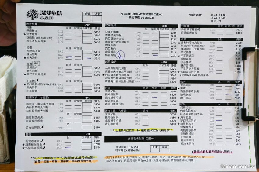 小希臘清新風的「Jacaranda小森活」溫馨又平價,餐點的義大利麵、焗烤、燉飯、火鍋都在水準上,不用開半小時到一小時的車到台南市區就能享受平價簡餐、義大利麵,有來新化玩的朋友,可以一起規劃在行程裡,讓旅途更豐富。