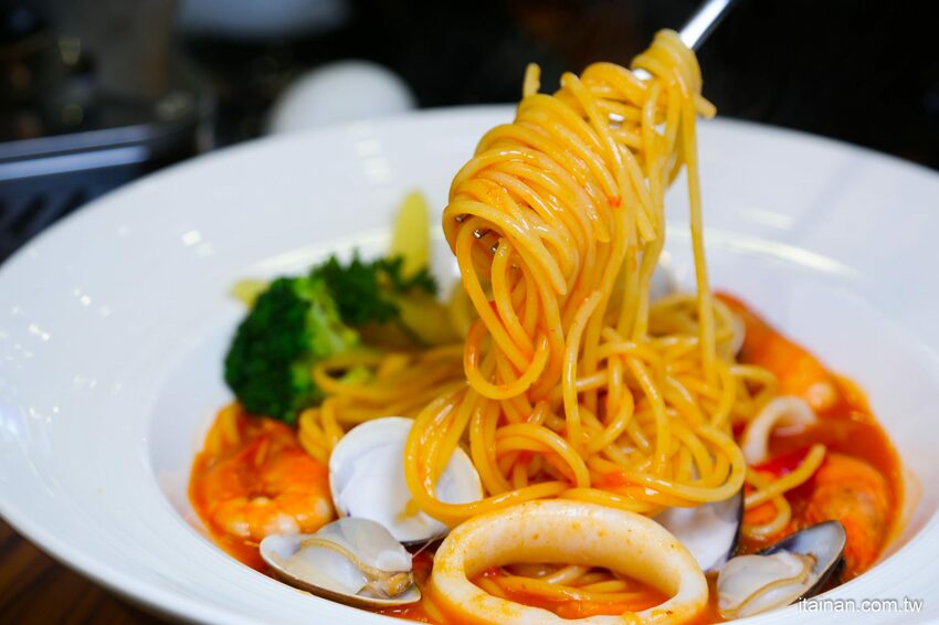 選了直麵來搭配漁夫海鮮義大利麵這道餐點,直麵是在義大利麵中較不易吸附醬汁的搭配上紅醬整個負擔更低,很適合愛美的女孩們來吃。