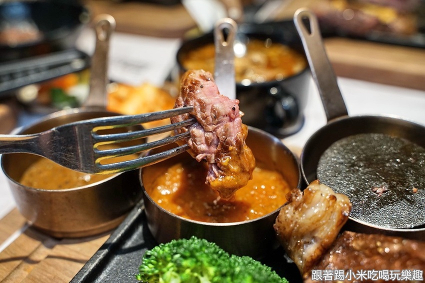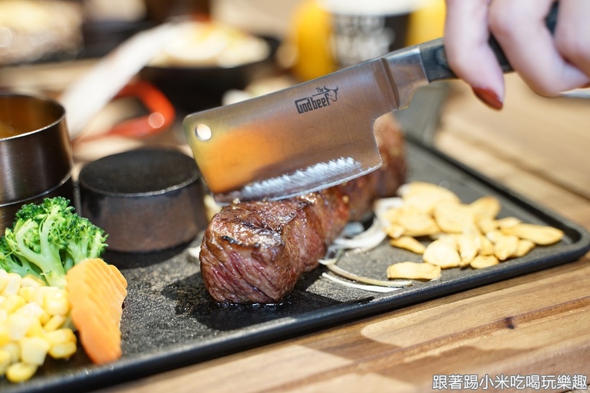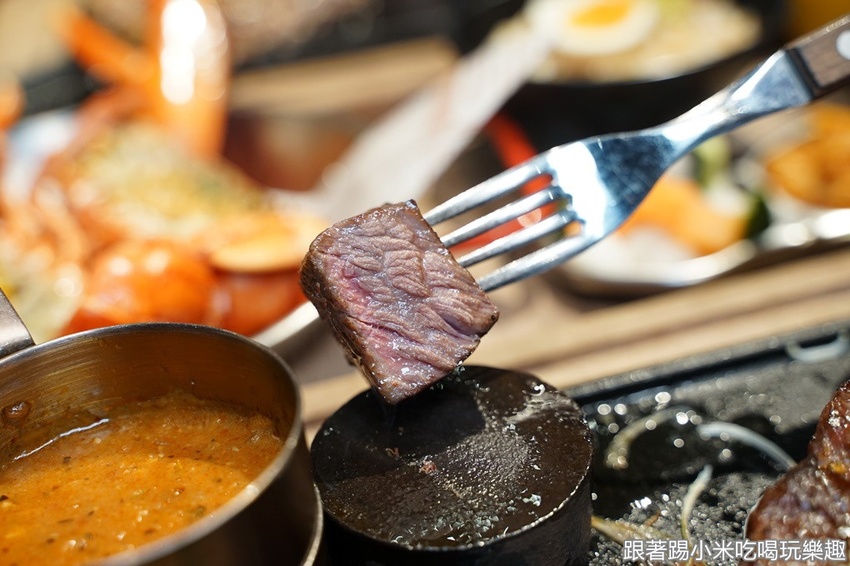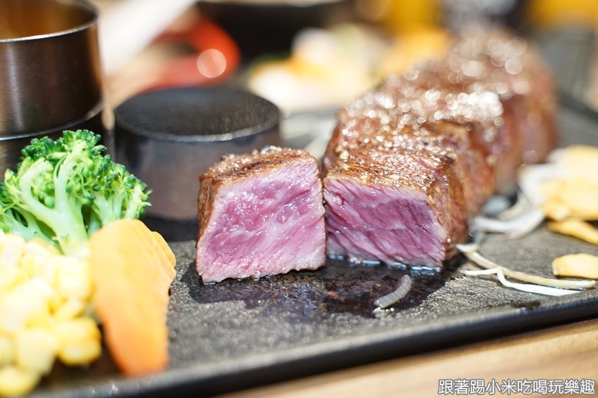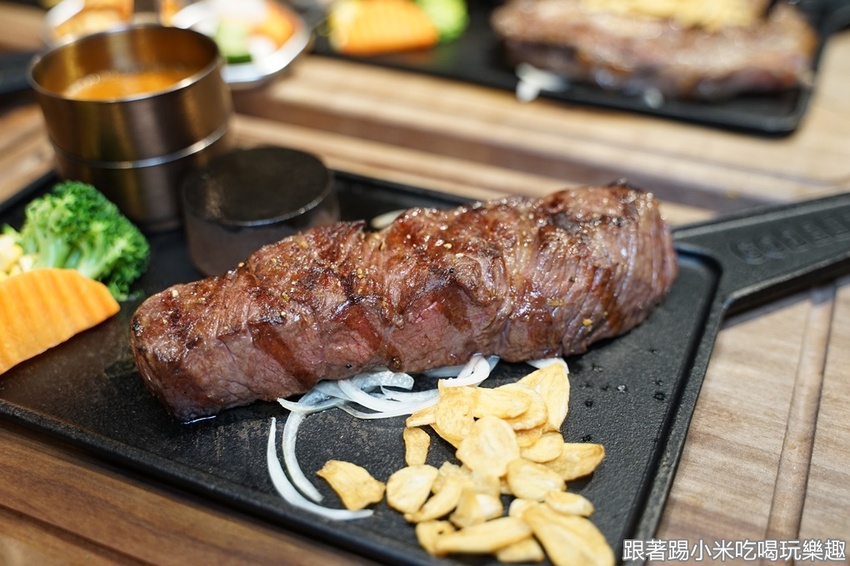 準備開始吃肉肉囉~小米很喜歡的是他們的巴菲特私房牛排(699元),有炭烤的金黃色烤紋,上桌時聞到香味,拍個照就想要趕快吃啦~
