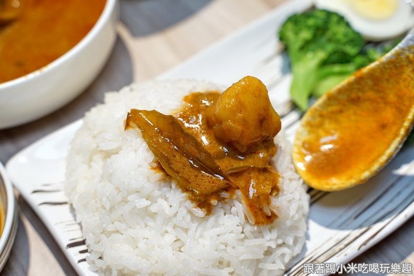 南洋咖哩是比較濃稠,加上香料吃起來是比較鹹香帶小辣的口味,淋到長米飯也非常下飯,裡面的馬鈴薯也燉煮的入味。還沒吃雞腿就讓小米扒好幾口飯了