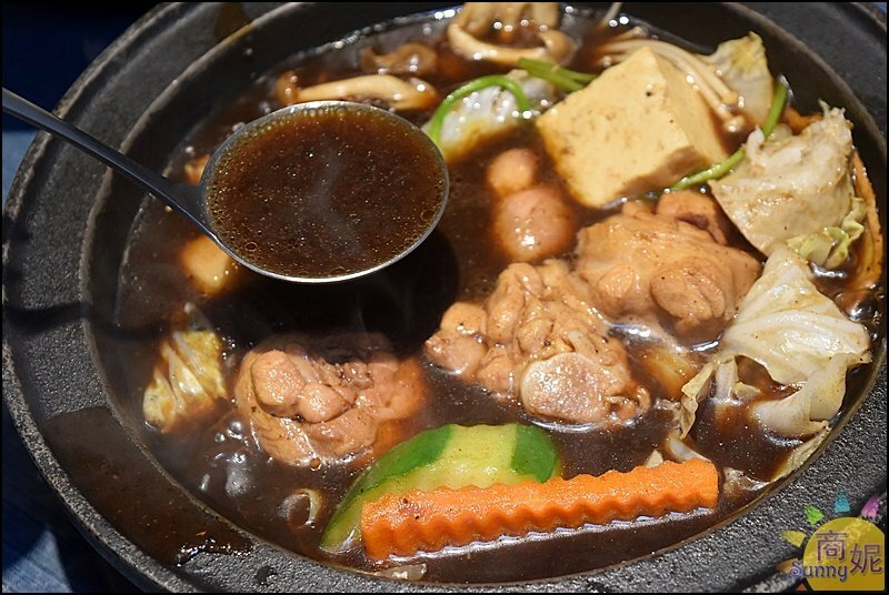 湯頭色澤較深,是黑蒜頭加上平價版人蔘-古早味菜脯一起熬煮而成。味道香濃非常甘甜好喝!加上炒香的大塊雞腿肉,冬天溫補吃這一鍋很適合。