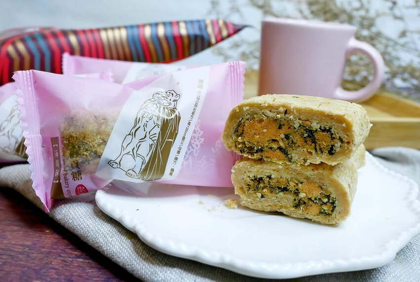 以糖酥做外層.內餡包入抹茶杏仁.酥脆不黏牙.吃完後滿嘴都是淡淡的茶香及花生味.這口味挺獨特的