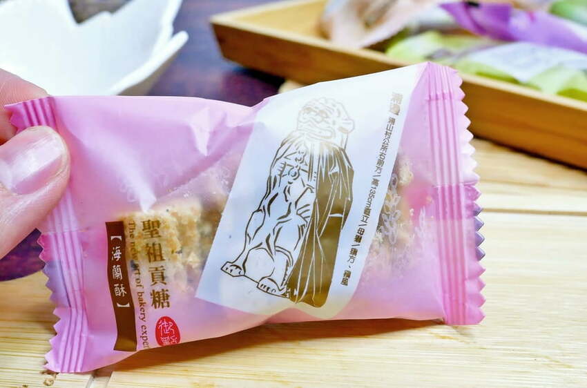 一包包的貢糖外袋顏色都不一樣.上面有師爺的畫像也資料.仔細看看挺有趣的!