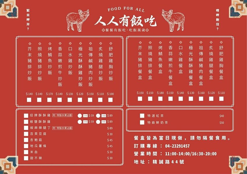 人人有飯吃 菜單,以手路菜+日式炒飯為主,餐盒中的主食都搭上6-8種配菜,主食有女孩最愛的低卡以及重口味或功夫菜等,日式炒飯一樣有主食可以選擇,讓炒飯吃起來更澎湃! 另有單點炸物以及飲料,目前點餐盒就送紅茶唷!!