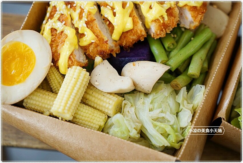 每日餐盒內都會搭配6~9種菜色,時蔬會依照季節去變化,以當季蔬菜為主,並以川燙食材來襯托出食材的原始風味,小涼當日餐盒內的配菜有高麗菜、四季豆、小番茄、玉米筍、生菜、紫薯、杏鮑菇、糖心蛋等8種! 青菜類吃起來都保有鮮脆的口感、不會水煮得過於軟爛、紫薯鬆綿很好吃,玉米筍除了脆口以外還很甜呢,糖心蛋一口咬下軟嫩的蛋白以及蛋黃香味溢滿口中,好愛這滋味!!!