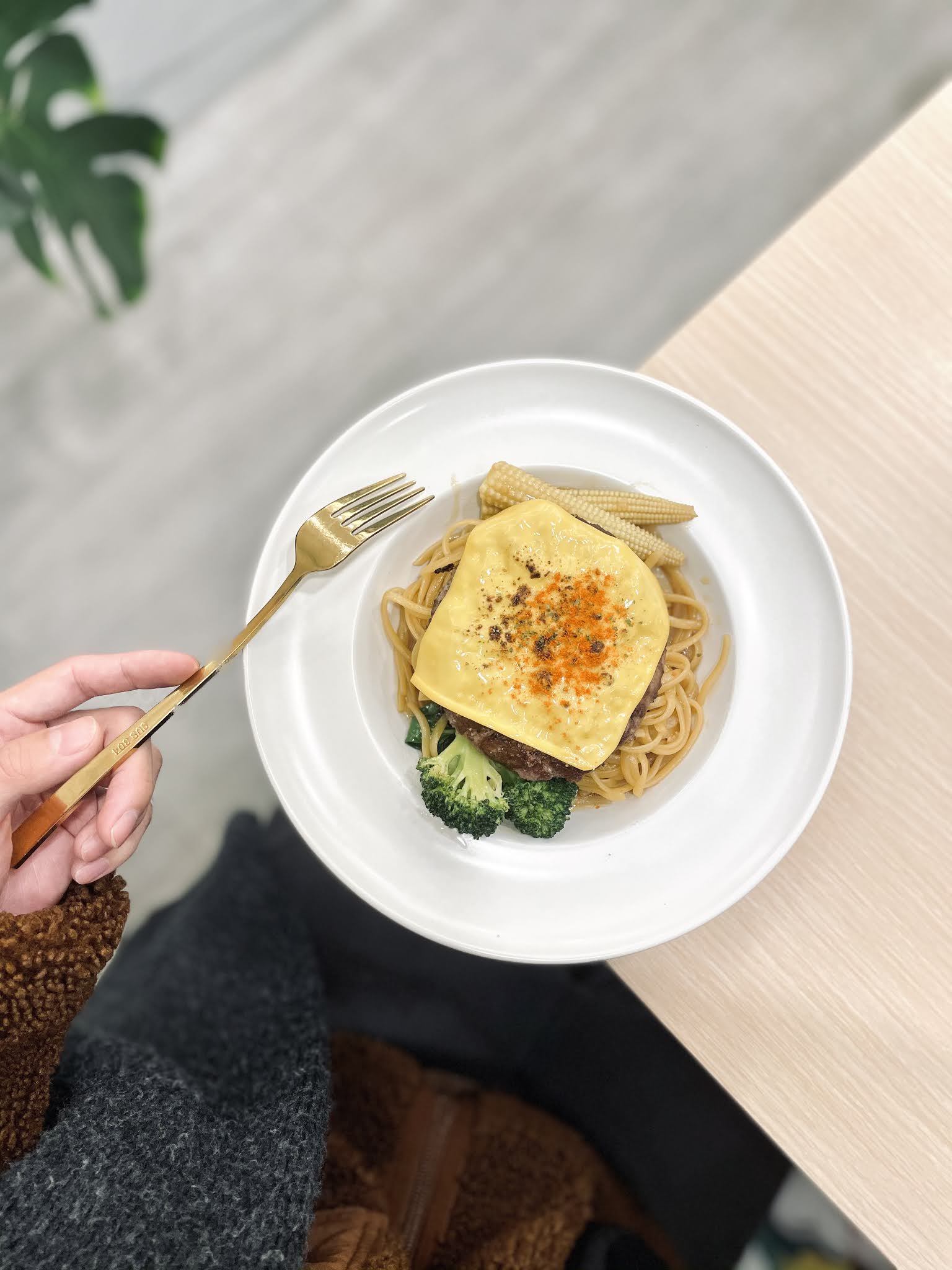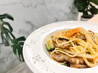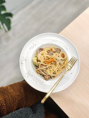 接下來是 Laymoon 的招牌麵宇宙系列,我看到什麼跟鹹豬肉有關的,都一定要點來吃,只是沒想到能在一間咖啡廳擁有這種幸福,麵體煮得恰到好處,麵量也絕對夠吃,豬肉的鹹度,取代過往義大利麵各種紅白青醬的調味,我覺得是很棒也值得鼓勵的嘗試!(個人私心覺得好吃)