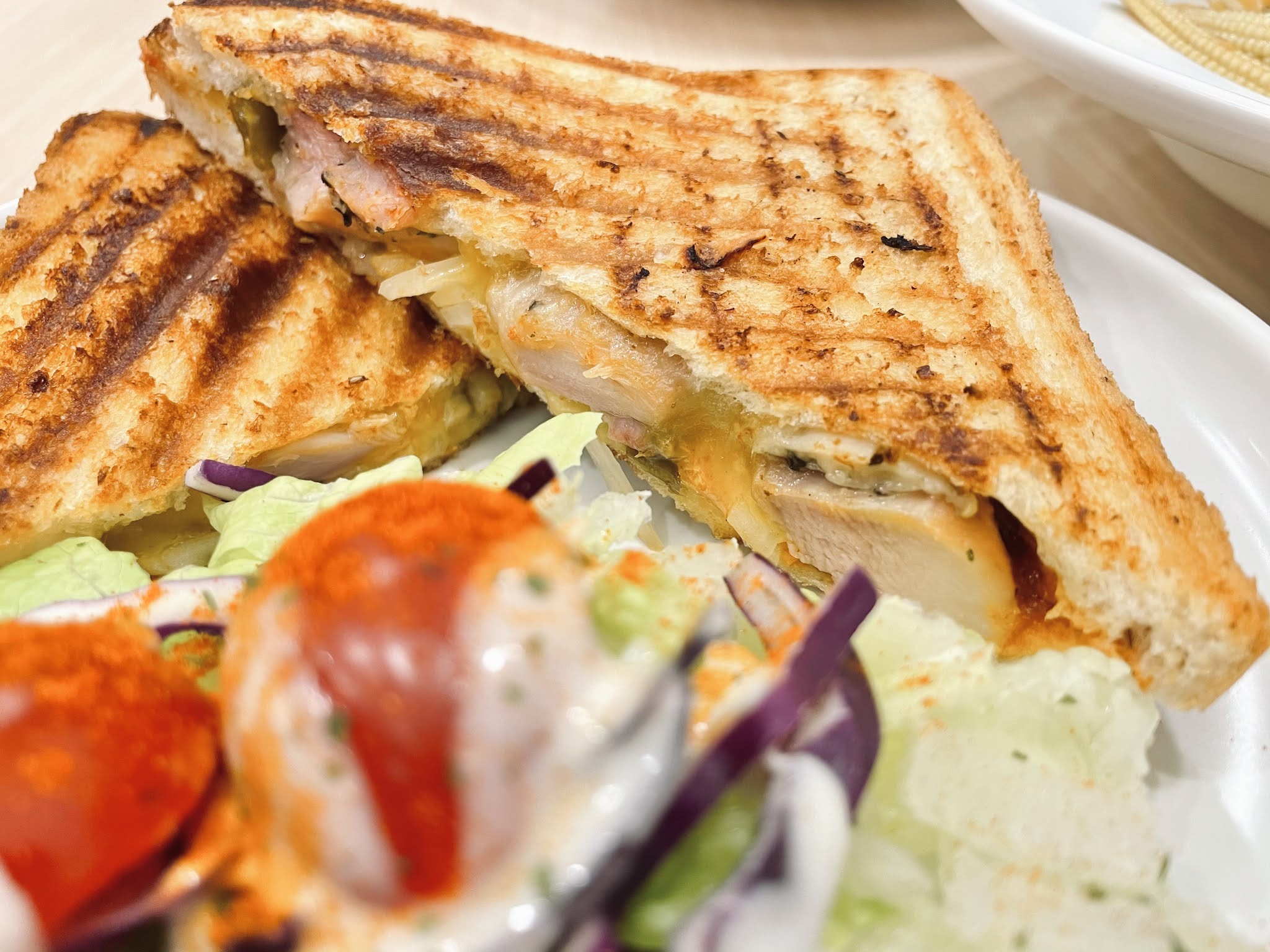 從小吃遍北中南各地的帕里尼,為了要達到 brunch 的清爽與無負擔,大部分店家很少推出這個豐富味道的鹹食口味,其實只要配一杯茶,加上配餐的沙拉,真的可以放心點下去,剝皮辣椒雞肉的調味也是驚艷我們的一道!