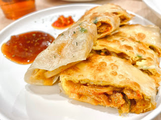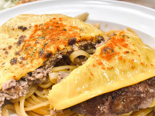 肉排被起司片擋住,不然真的可以看到肉排大小幾乎要佔去視覺表面的1/2,特地也拍了一張切麵給大家看,肯定得特別給他一個 spotlight,因為「三杯」的口味真的好特別,有夠滿足我這種熱愛台式料理的人,這一道飽足感超夠,女孩子要適量挑戰喔!