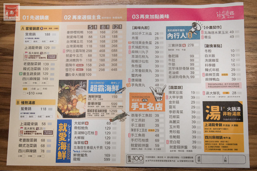 今天就帶大家來北門路吃『就愛這鍋』,雖然門面是白色的,但因為就愛這鍋周邊的招牌都五顏六色的,所以只要認明白色建築就很容易找到了。看到店外掛著布條XXL大肉盤只要189元起,價位這點就很吸引小編,再看了一下菜單,湯底58元起,湯底套餐129元起,還可以免費加湯,就感覺很超值,而且湯頭都是自熬,肉片都是原肉鮮切,整體價位算是滿平價的。