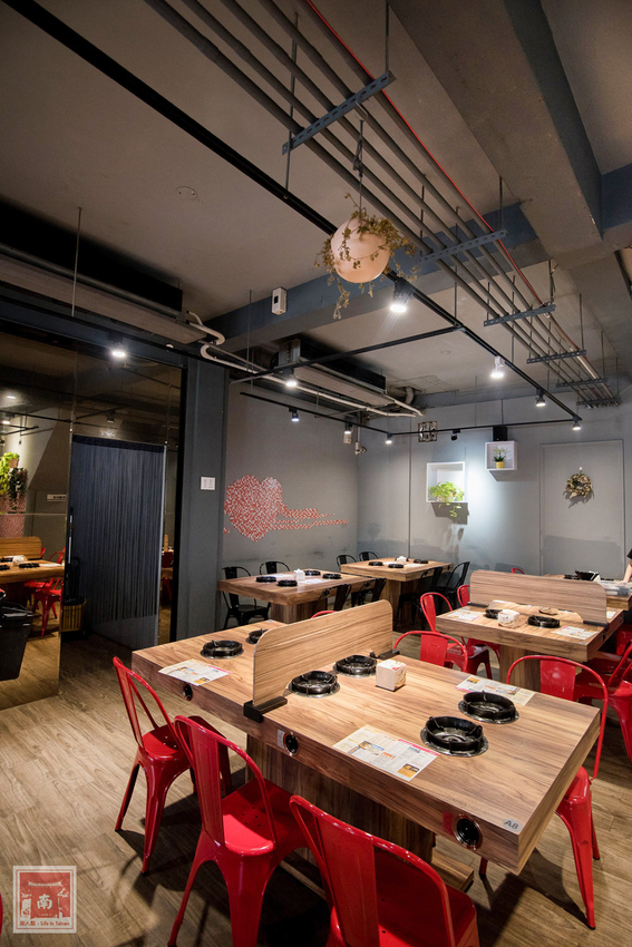 店內以木頭色系為主,灰色牆面和黑色柱子,整體給人沉穩的感覺,但又因為牆面有一些植物和花紋做裝飾,又搭配紅色的椅子,讓原本沉穩的店裡讓人更親近,原本就不算小的空間又因為鏡子反射,視覺上讓空間更加放大,帶點輕工業風格。