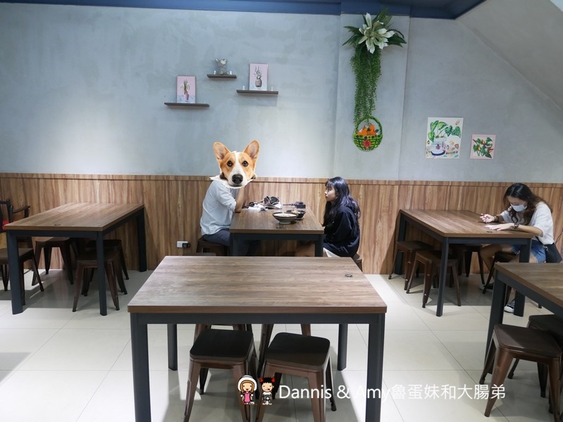 水泥色牆面搭配木紋色桌椅,加上店家有使用一些綠色植裁、畫框做配色點綴,
