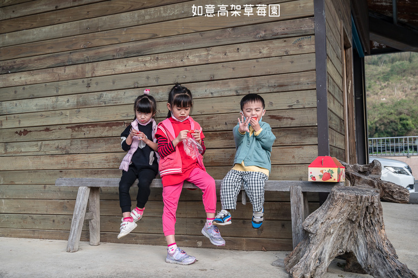 把採好草莓給老闆算完錢就可以吃草莓啦~看看這三個小孩,那吃到草莓滿足的樣子,最開心的應該就是這個時候了,而且坐在這邊吃草莓也太可愛了吧!想說幫他們多拍幾張,結果每個人都顧著吃草莓,根本沒人要理我,草莓的魔力啊!
