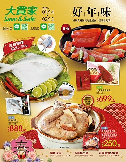 大買家量販店,這次年貨檔將頂級海鮮,人氣老店美食、圍爐必吃老字號火鍋料、宜蘭鴨賞、埔里老店紹興香腸、冬令進補雞湯、各地人氣伴手禮、古早味零嘴等等…都擺放在一樓的生鮮冷凍區、水產區以及食品雜貨區,讓顧客可以盡情地與家人慢慢逛、慢慢挑選~~