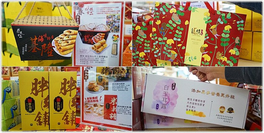 左上:基隆十大伴手禮、特色伴手禮”蔡技 綜合夾心手工蛋捲禮盒“,比一般蛋捲重達2倍的海味蛋捲。右上:龍情情意花生軟糖禮盒、來自桃園第一品牌伴手禮、花生軟糖有6種口味,每一口味都是黏而不膩、齒頰留香的美味,送給重要的朋友嘟嘟好。左下:胖肉舖肉鬆餅禮盒,這可是網路口碑熱銷美食。右下:飲玖黑麥白玉耳露,是款養生的飲品,送給長輩有著滿滿的心意。