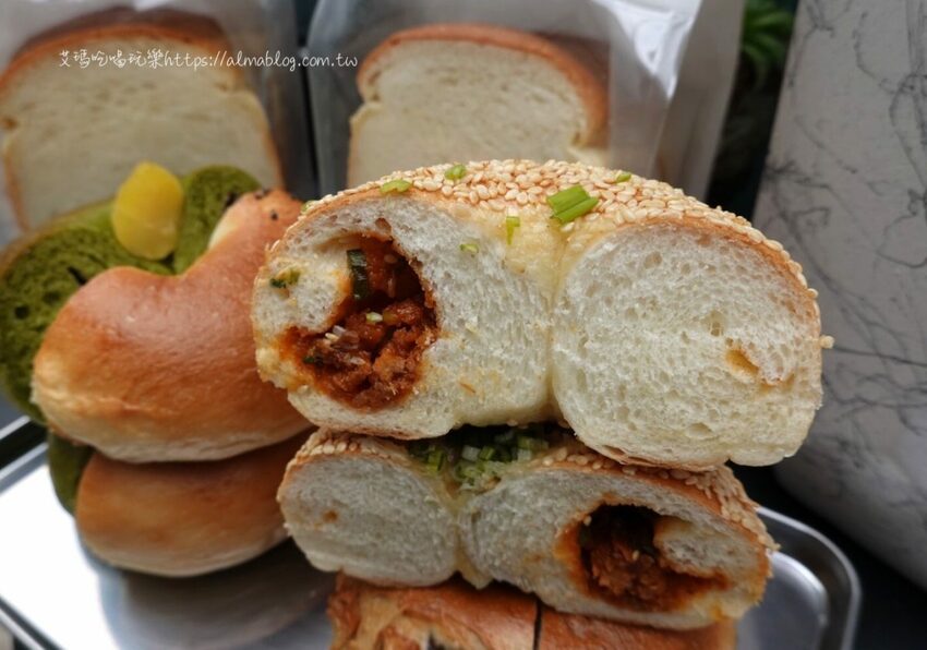 跳脫對貝果的既定印象,上層滿滿白芝麻加蔥花好不真實!中西合併的創意貝果,遠遠就能聞到香氣,咬上一口好Q真有咬勁,口腔裡都是傳統台式肉餅的香氣,港式叉燒肉質很綿密,鹹味淡、甜味明顯,整個就是鹹甜交織。