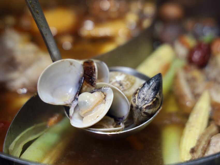 蒙古紅火鍋的白湯有別於一般的涮涮鍋,用龍眼、枸杞、黨蔘、紅棗數十種的中藥,再和雞骨、雞爪所熬製而成,而且沒有加入油、鹽及味精,純天然藥材熬成,這真的覺得好安心!龍眼帶殼一起熬煮,據知是比較不燥。