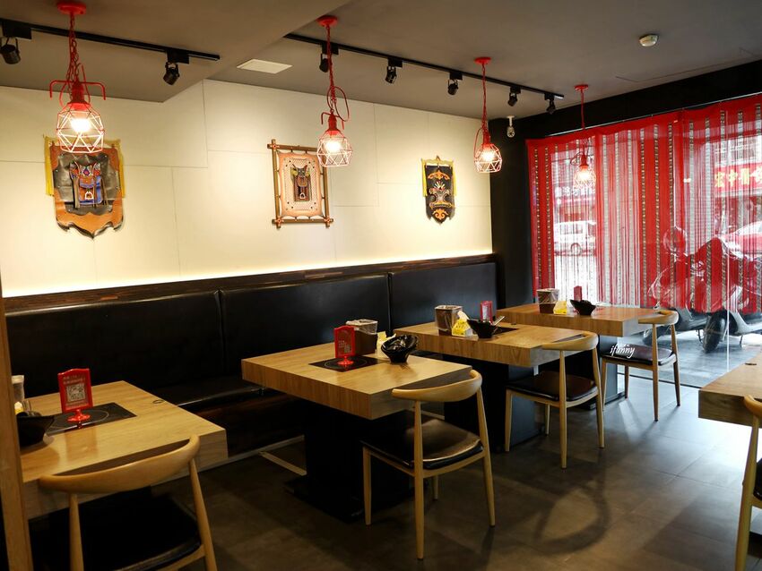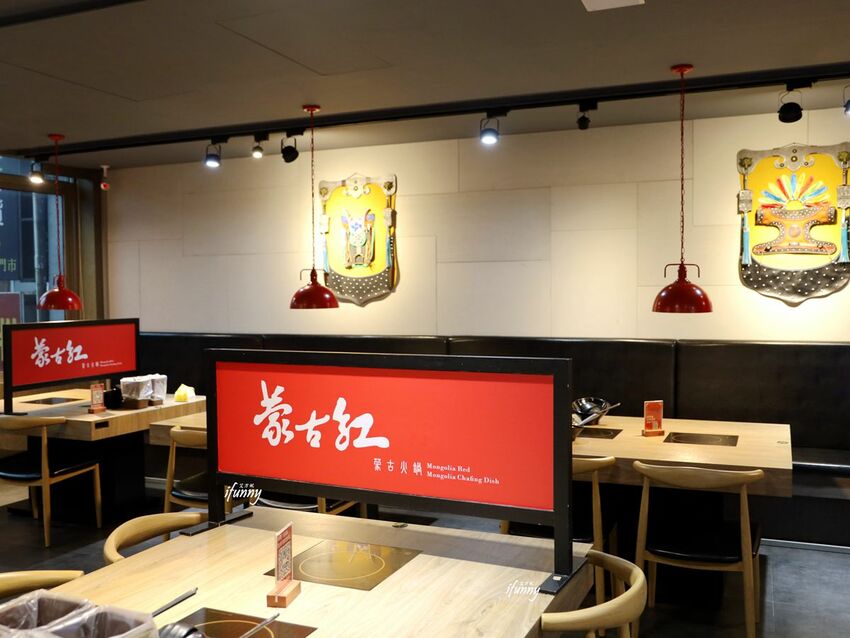 蒙古紅桃園店有著一二樓寬敞的空間,紅色珠簾、造型燈具加上木質的桌椅。