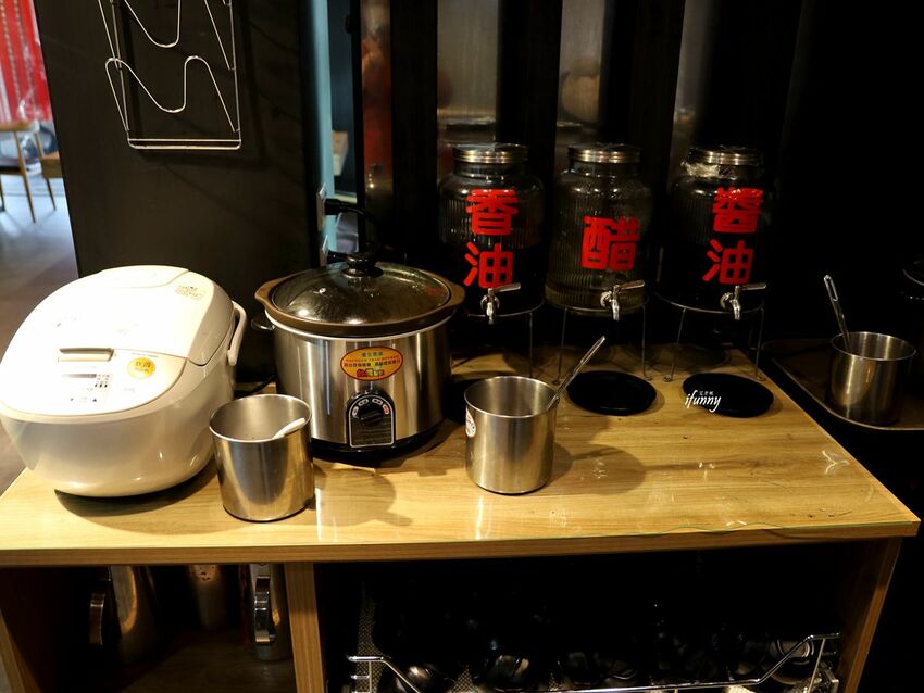 辛香料及醬料區,另備有滷肉鍋及白飯,可以自製成滷肉飯。