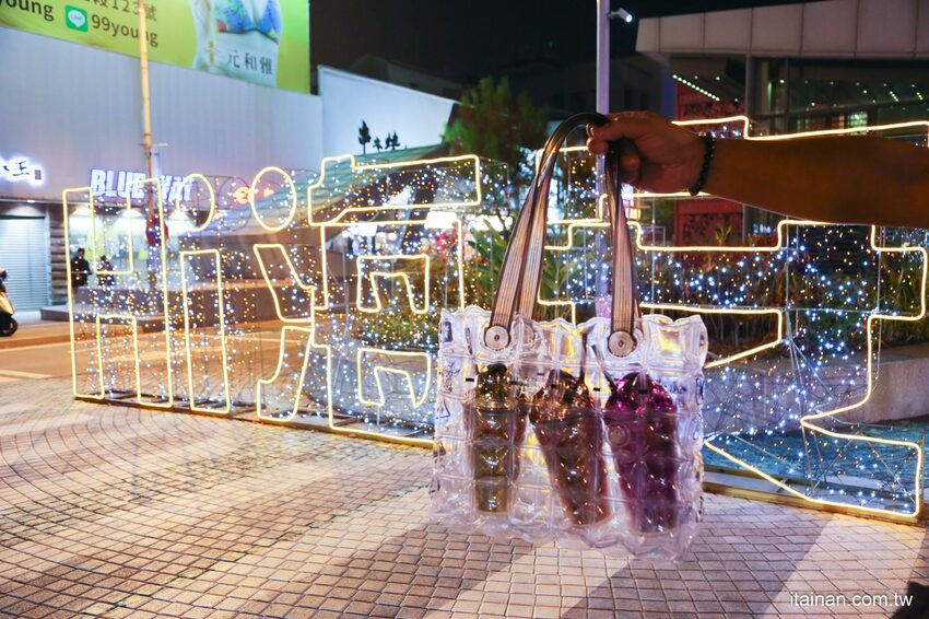 新品項乳酸女神泡泡飲,以原裝美國知名大品牌Natura微礦氣泡水加入了乳酸,保留乳酸酸甜滋味,與細緻的氣泡飲完美調和。瓶子取名為愛你千鎚百戀瓶,是以超狂的雷神之鎚造型設計外,四個面都是不同的圖案。一面設計有TAINAN的字樣,上面有4個最具代表台南歷史的古蹟安平古堡、赤崁樓、孔廟、台南地方法院,充分表現出在地台南味,另一面則是「朕心加加」的LOGO,又酷又文青。