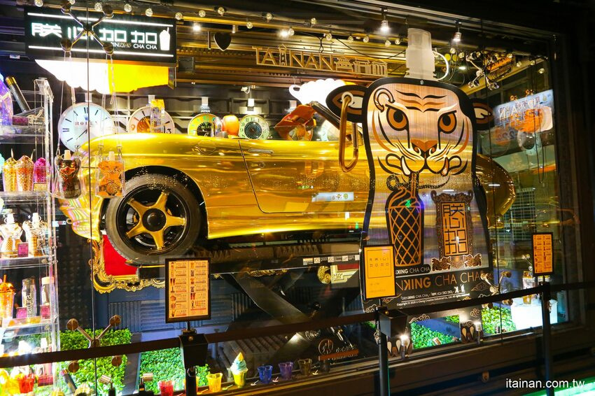 「朕心加加」為了要呼應市府想將海安商圈打造成香榭麗舍大道,以平光黑色鐵件為主體,找來一輛來自南歐的敞篷車放在店裡的櫥窗,打造出台南新地標,搭配印有台南代表性古蹟的飲料杯,希望能讓來到台南的朋友都能對台南印象深刻。(初訪文章點我)