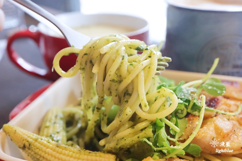 義大利麵吃起來是一般台灣能接受的硬度,略微軟一點點,醬汁充滿羅勒香氣