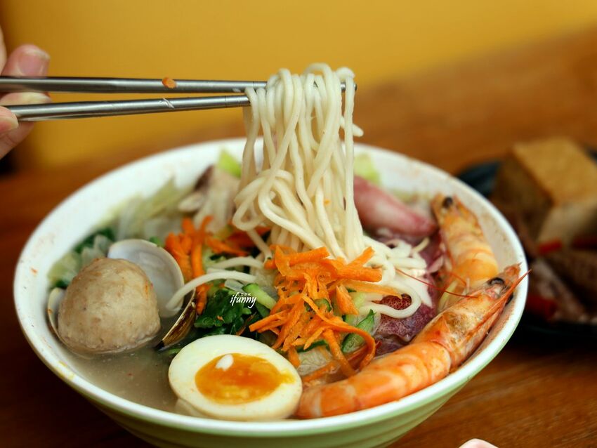 海鮮功夫麵內有鮮蝦、小卷、鯛魚片、蛤蜊、貢丸、胡蘿蔔、小黃瓜、青菜、高麗菜,再加上半顆溏心蛋,整個配色及營養均衡都在這一碗麵呈現了!