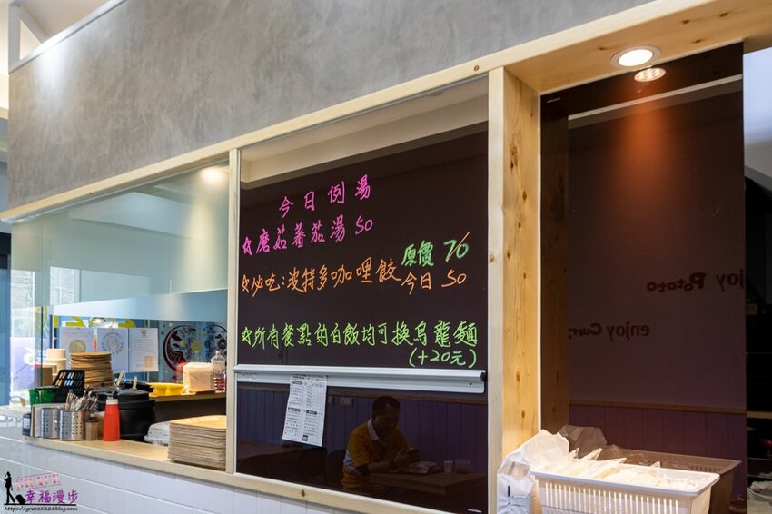 黑板上有寫著今日例湯的品項,還有當日的特價商品,而且所有品項都可以加價換烏龍麵喔!