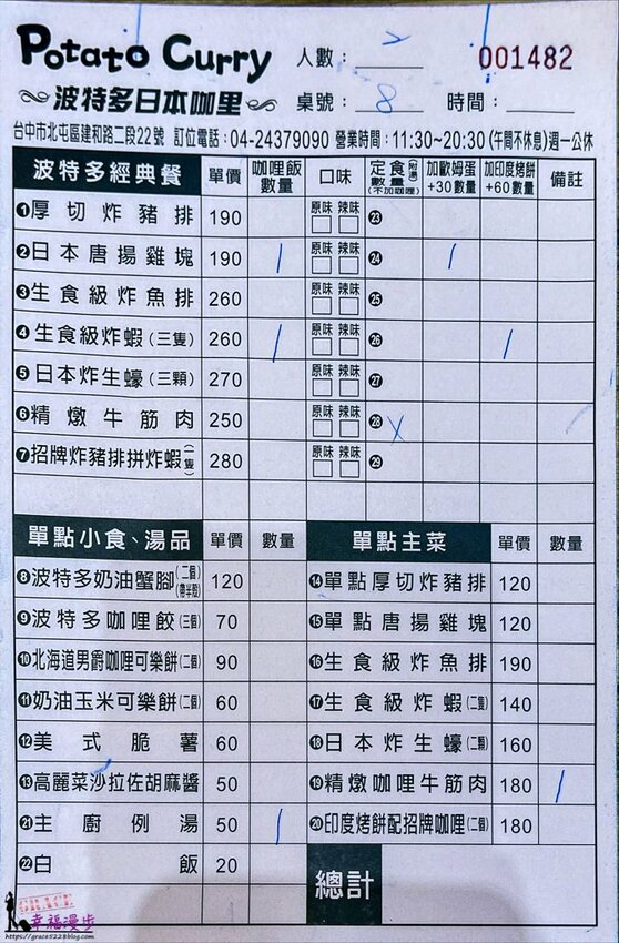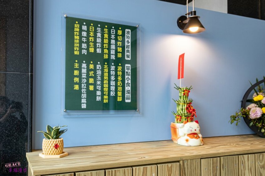 Grace很喜歡的三合屋手作壽司,最近在北屯區開了一間新的波特多日本咖哩屋,這家店是專賣日式咖哩,今年一月才開始試營運就已經常常生意爆滿,而且在店家粉絲頁看到這裡的魚排、生蠔、炸蝦都是採用高品質生食級的食材,讓我更想來品嚐看看,店家位置就位在景賢路和建和路,附近路邊都很方便停車,以藍白為主題的招牌上面有著咖哩飯的圖案,清爽明亮的招牌相當醒目。地圖導航🚗請按這裡