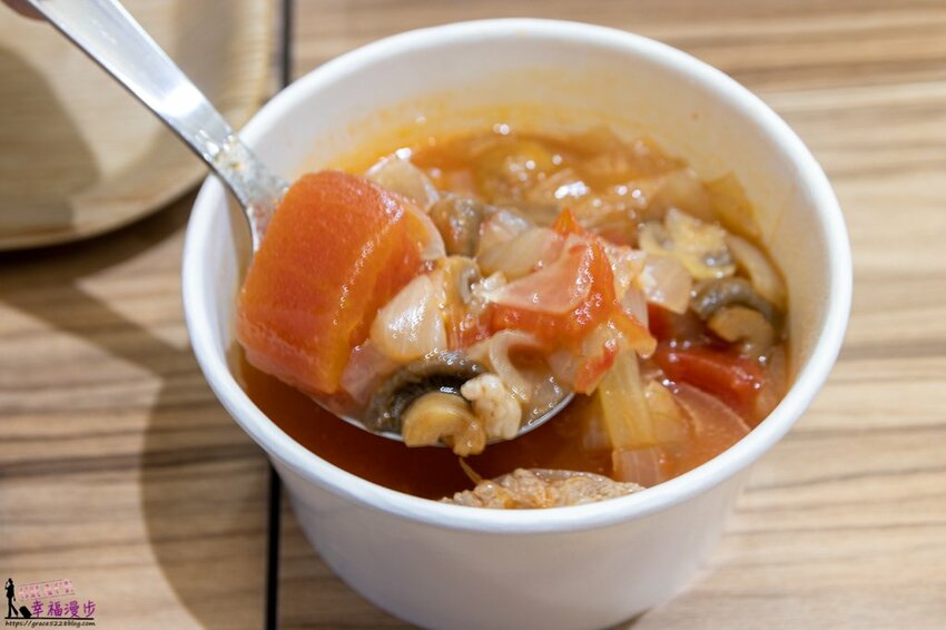 主廚例湯價格50元,湯品每日都不同,當天的例湯蕃茄蘑菇湯,這個湯有著很豐富的食材,裡面有洋蔥、蕃茄、蘑菇,來自蔬菜本身的甜度帶出蕃茄微微的酸度,微酸微甜的口感相當解膩。