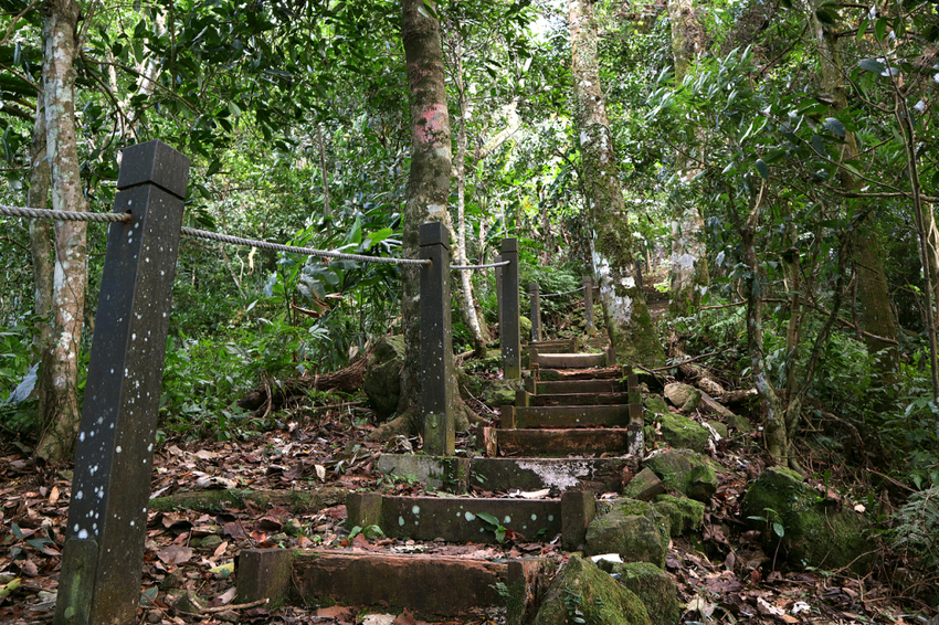 步道幾乎由木棧道、石階組成,石階上幾乎都有防滑菱形刻痕,雖然前半段坡度頗高,但步道兩側幾乎都是高聳柳杉、樟樹及豐富綠蔭植物,走起來還是滿舒服的。