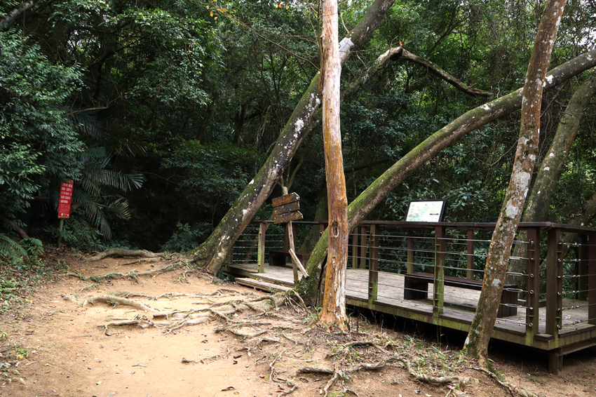 步道到達900公尺的平台,會有兩條方向可以選擇,一個是往猿山步道(圖中紅色警示牌處),目前看管理處的網路公告是封閉中,且這段路況較偏原始山徑,建議暫時不前往;平台下方有一個階梯就是往藤坪大石壁的方向前進。