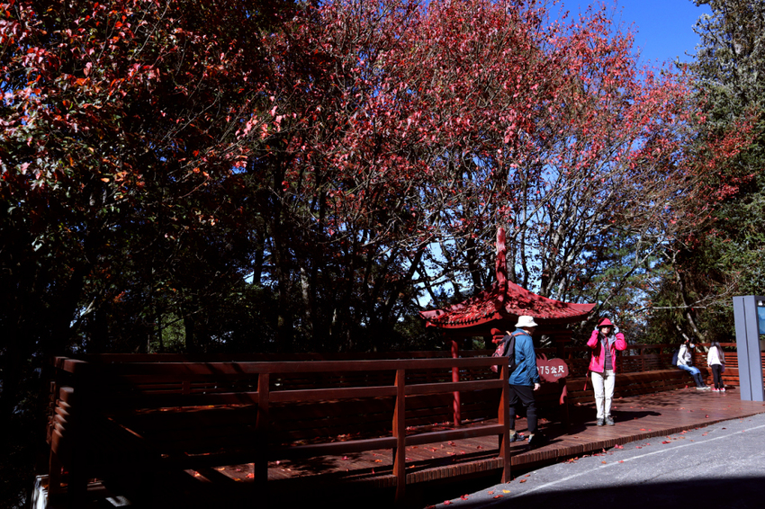 遊客中心、住宿區也有一整排的楓紅了(台灣紅榨楓),非常豔紅,很多叔叔阿姨們,都在排隊拍照。