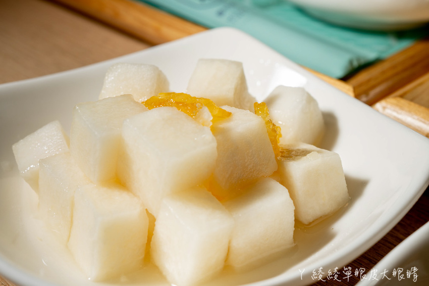 每天都會更換不同小菜,這道是我們加購單點的,柚香豆薯吃起來有點像軟脆的梨子,帶有柚子的香甜味,不過我本身就不太喜歡這樣的口感,所以就看個人口味囉。