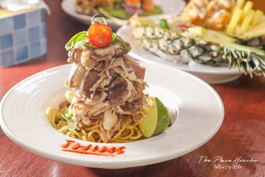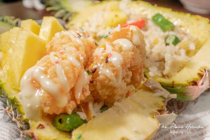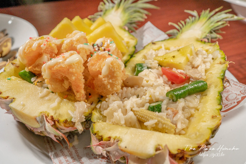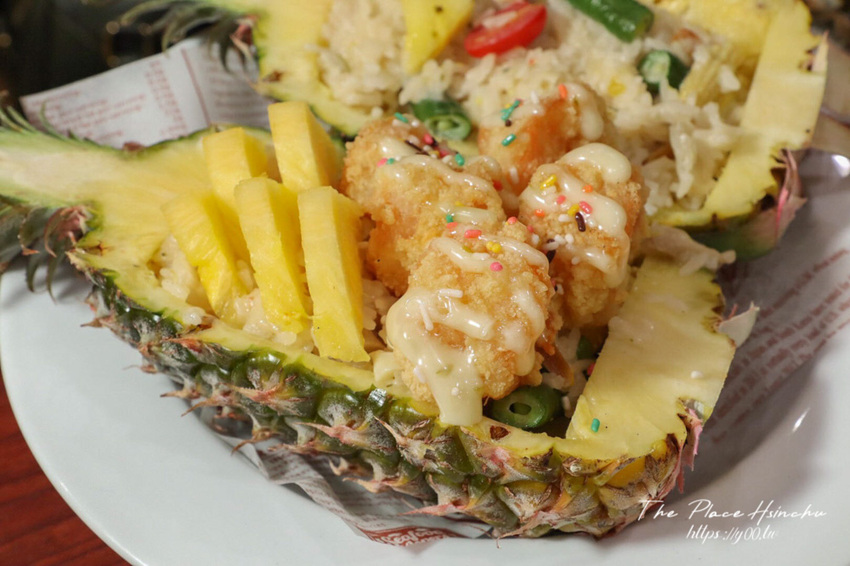 哇!第一次看到這麼可愛逗趣的造型,一整顆鳳梨裝著滿滿的燉飯、新鮮鳳梨片跟鳳梨蝦球,配菜還有玉米筍、小番茄、豆子、菇類等等,好吸睛喔!每日限量,要吃要早點去喔!