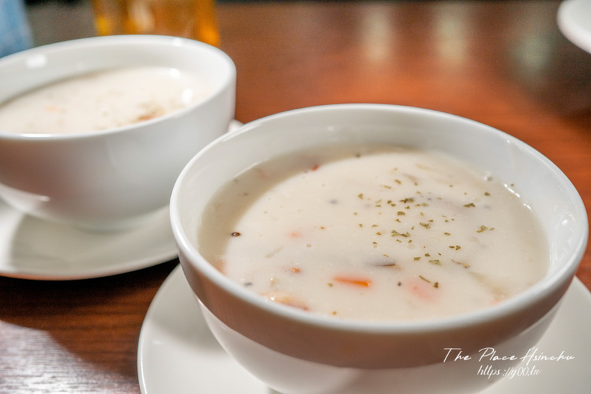 鹹甜交錯的奶油餐包也是蠻常見到的,至於濃湯勾芡感較重,喝起來很濃稠但沒什麼味道,有建議主廚可以再調整鹹度,這碗有培根、洋蔥、紅蘿蔔、玉米、馬鈴薯等配料豐富。