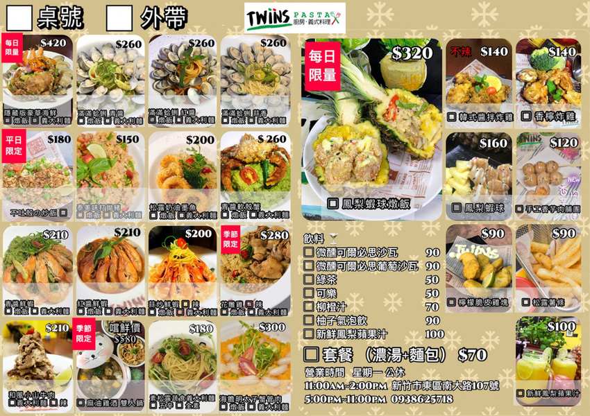 TWINS廚房義式料理位於新竹市東區南大路上,就在新竹轉運站的斜對面,附近就是新竹火車站後站收費停車場,可停汽機車。