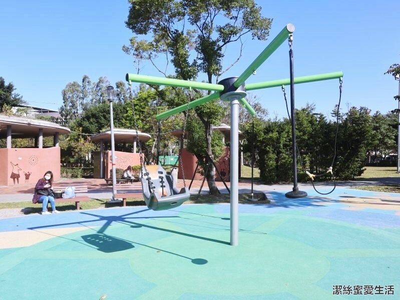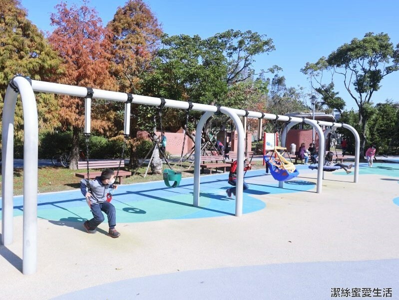 盪鞦韆當然也是不可少,現在特色公園都是共融型式,每個座椅都專為不同年齡層設計,不管是大小孩子都能一起玩。