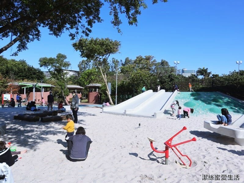 旁邊則是河流造景溜滑梯及沙坑,許多孩子都帶著玩沙工具來玩,細白的沙子很乾淨。