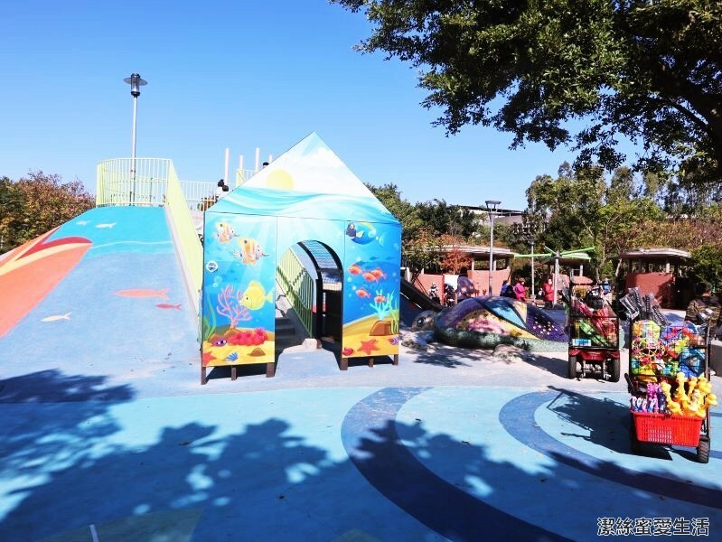 接著要到旁邊的遊戲場啦,共有五大設施,分別是宇宙旋轉/攀爬設施/共融式鞦韆/河流造景溜滑梯/沙坑。