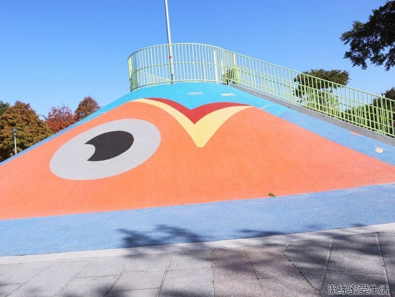 可以看到彩繪小魚兒到處游,有兩條繩索梯道往上爬,由於坡道是PU防滑材質,父母們可安心,比較靈活大些的核子根本不需要繩索就能直接爬上去啦。