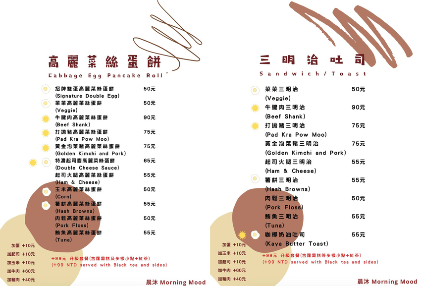 總結來說,Morning Mood 的價位比一般早餐店稍高一些,但是份量也不小。還有很印象深刻的是,雖然在店裡坐了許久,離開時身上竟沒有沾染到油煙味。就像店名一樣,早晨,讓我們沐浴在陽光下,一起來份早午餐。