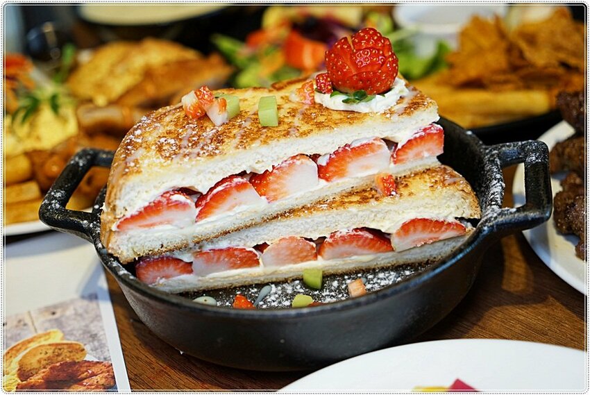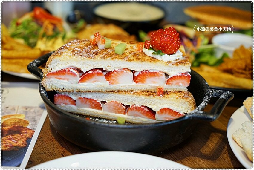 季節隱藏版“板煎草莓吐司“,,以奶油、糖將吐司煎至表皮金黃酥脆再抹茶自製乳酪醬,夾上新鮮草莓並灑上白色糖粉淋上少許煉乳,一整個就是讓女孩必點無誤!!