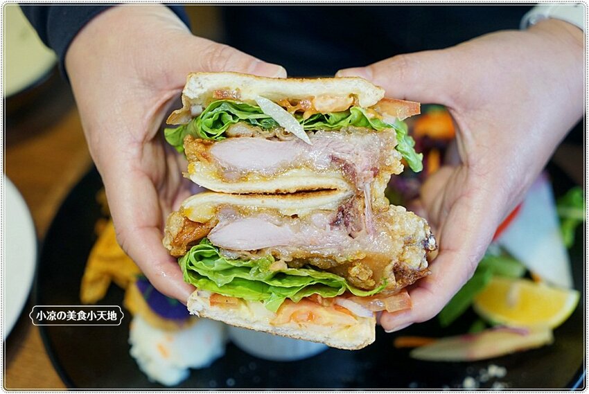 小涼很喜歡古巴三明治的麵包體,有著外酥內軟的口感,夾層中放入大量的生菜、洋蔥、番茄等時蔬,以及大隻的香炸雞腿排,不只是吃肉也吃的到纖維的健康,重點一個吃完相當飽足!