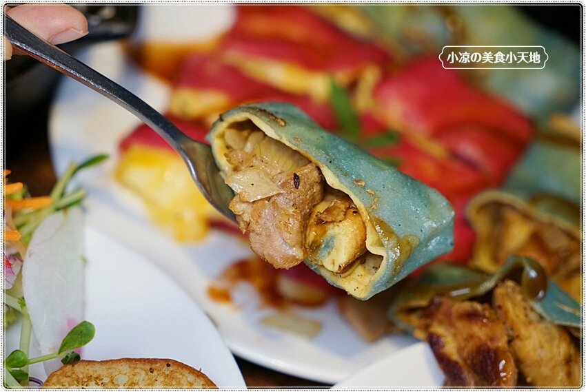橡木燻雞彩色蛋餅,彩色餅皮是隨機的唷! 當日搭配燻雞的是碟豆花餅皮,帶著淡淡的藍好美~~~