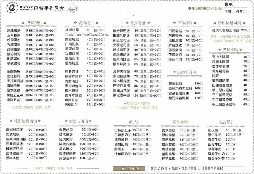 巴特手作晨食菜單,有巴特蛋餅、炙燒吐司、美式漢堡、手作捲餅、巴特鬆餅、純黑熔岩漢堡、古巴三明治、巴特小點、摩佐拉起司鍋、飲品、精品咖啡、現打果汁等百樣口味餐點任你選,一點都不用擔心不知道吃啥!!! 還有平日限定優惠,只要平日早上10點前,單點餐點、巴特紅茶免費請你喝唷!! (外帶、內用都可)